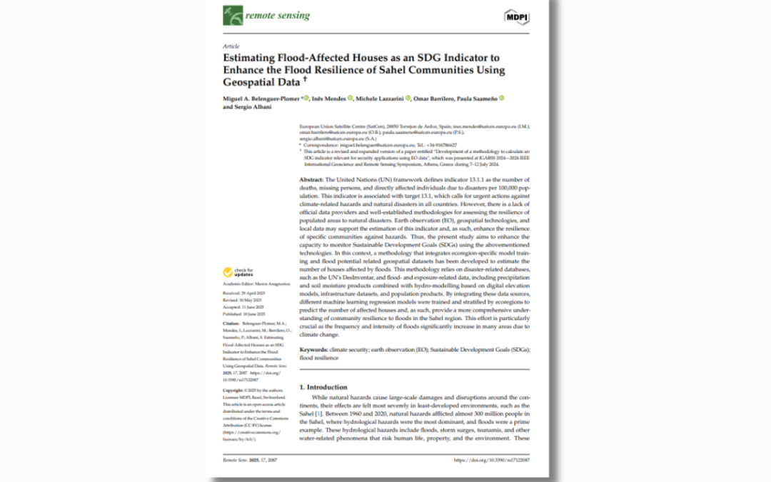 The SDGs-EYES project has reached an important milestone with the publication of an open access article entitled “Estimating Flood-Affected Houses as an SDG Indicator to Enhance the Flood Resilience of Sahel Communities Using Geospatial Data” in the Remote Sensing journal, detailing the technical development carried out within the Climate security pilot. This study presents a novel methodology to estimate flood impacts on communities, leveraging Earth observation (EO) and geospatial technologies. By providing actionable insights into community resilience, the research contributes directly to SDG 13 (Climate Action).